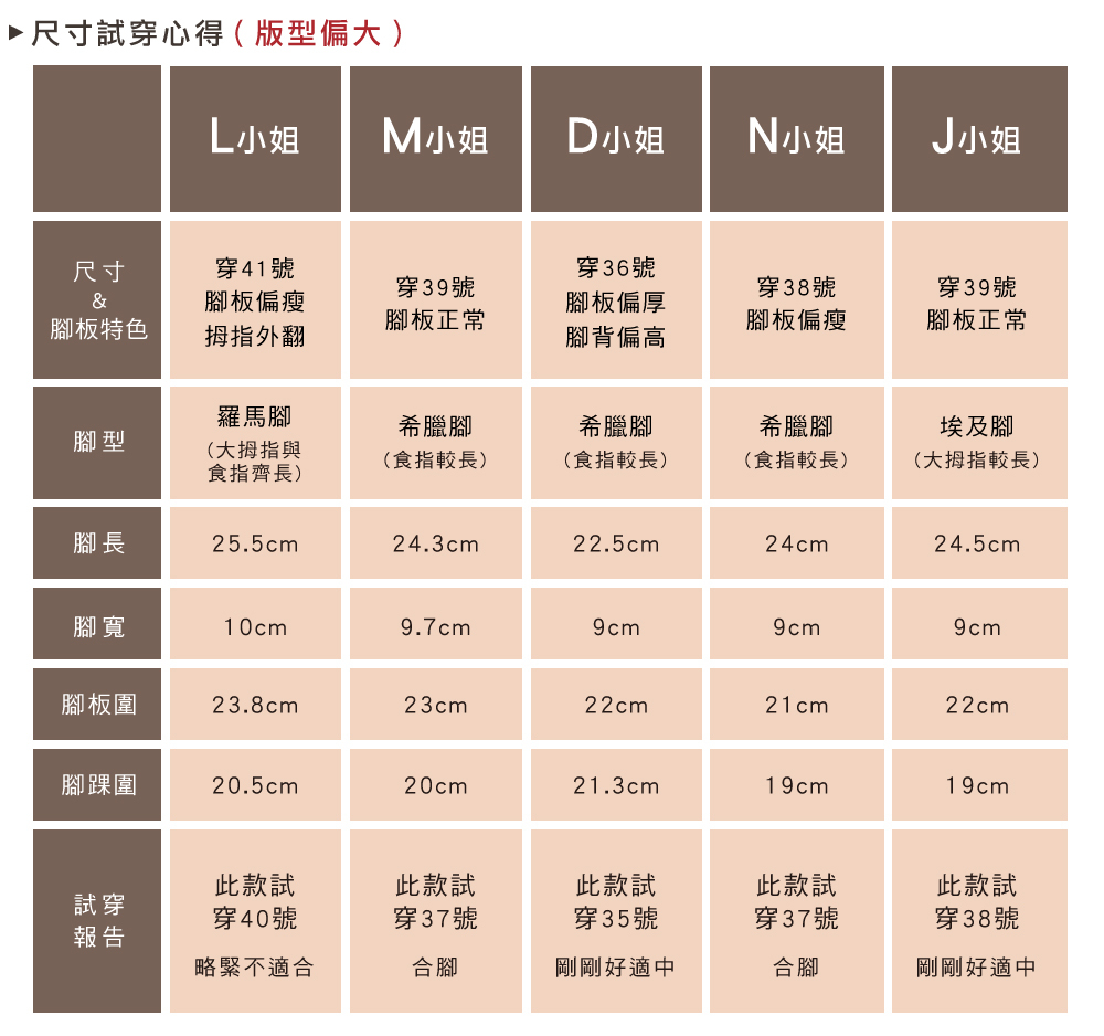 ▪ 此鞋款版型偏大,建議挑選小一號較合腳;若腳板偏寬/厚,可依平常穿著尺寸挑選