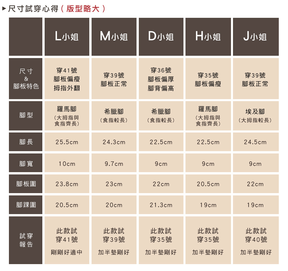 ※ 此鞋款版型略大,建議可挑選小一號較合腳;若腳板偏厚或有拇指外翻,則可依平常穿著尺寸挑選。