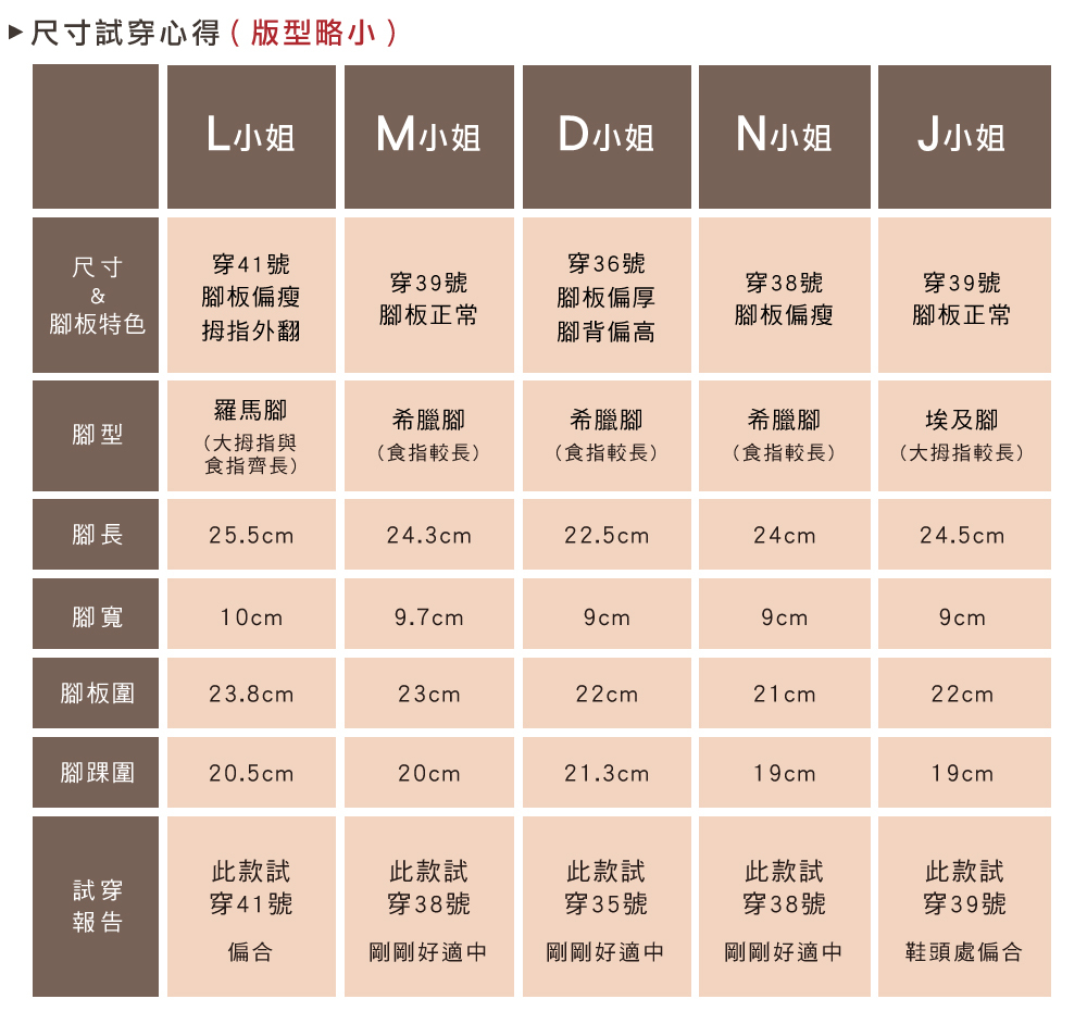※ 此鞋款版型略小,若腳板偏寬/厚或拇指外翻,建議挑選大一號較舒適;若腳板偏瘦,可依平常穿著尺寸挑選。