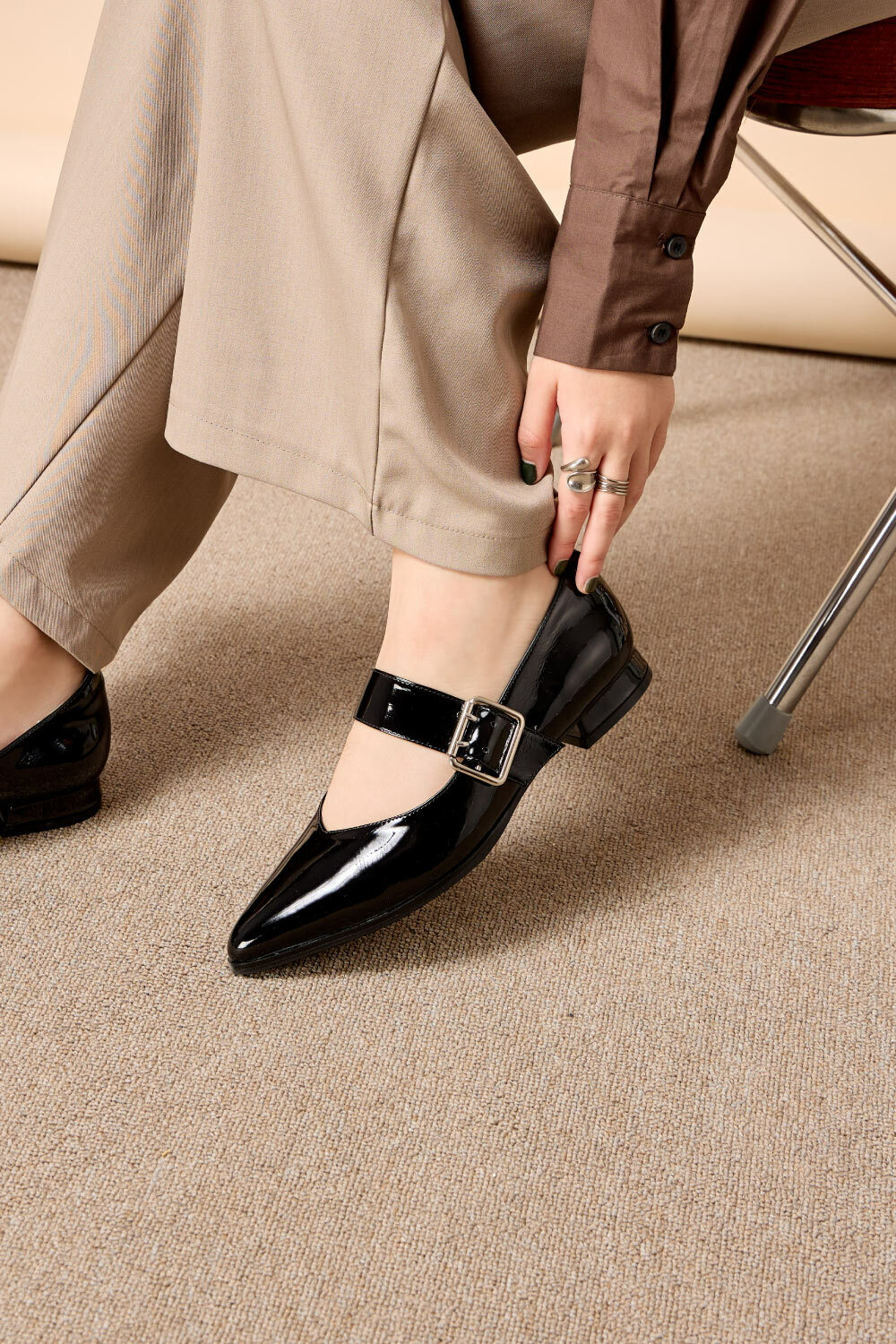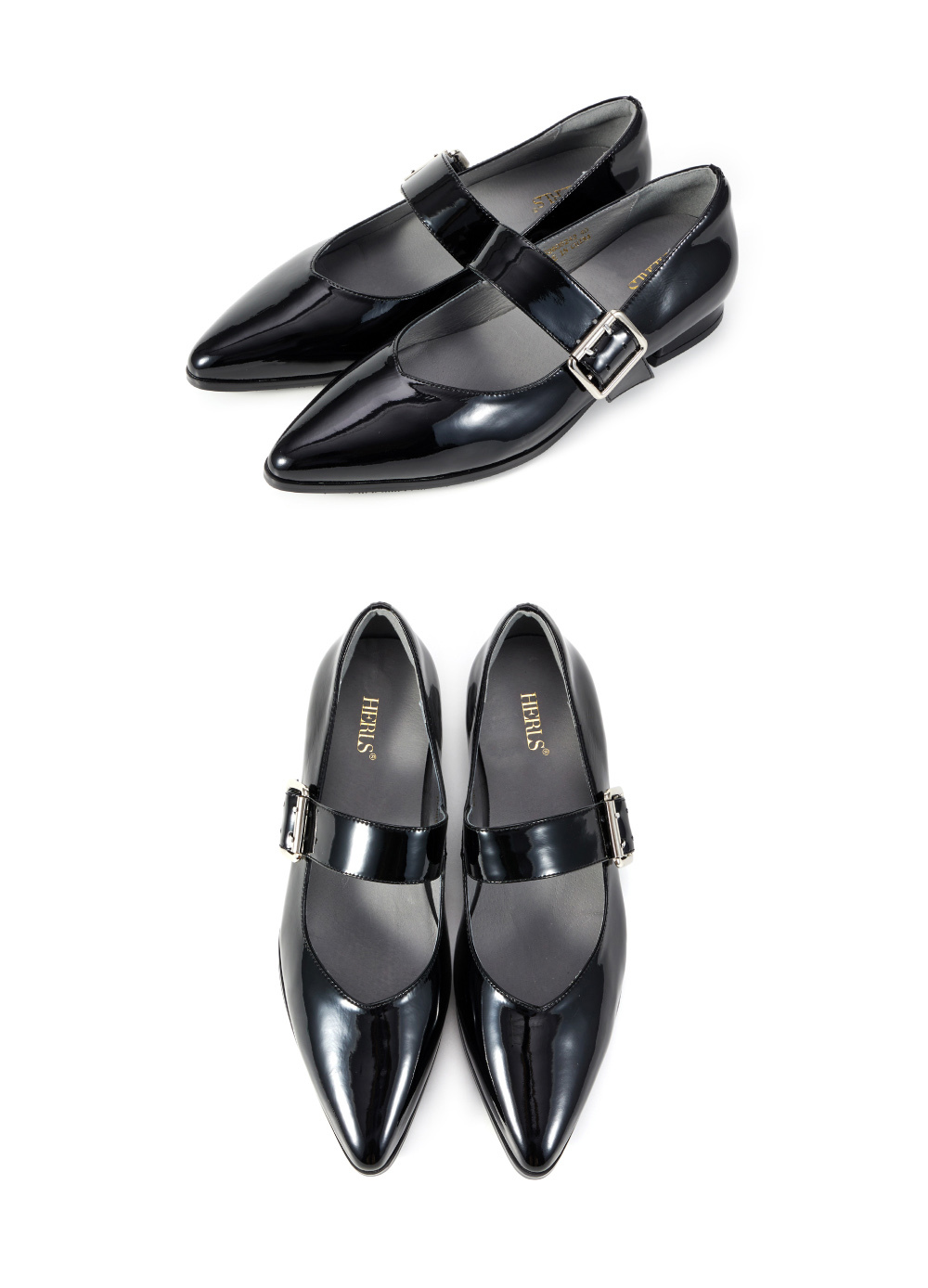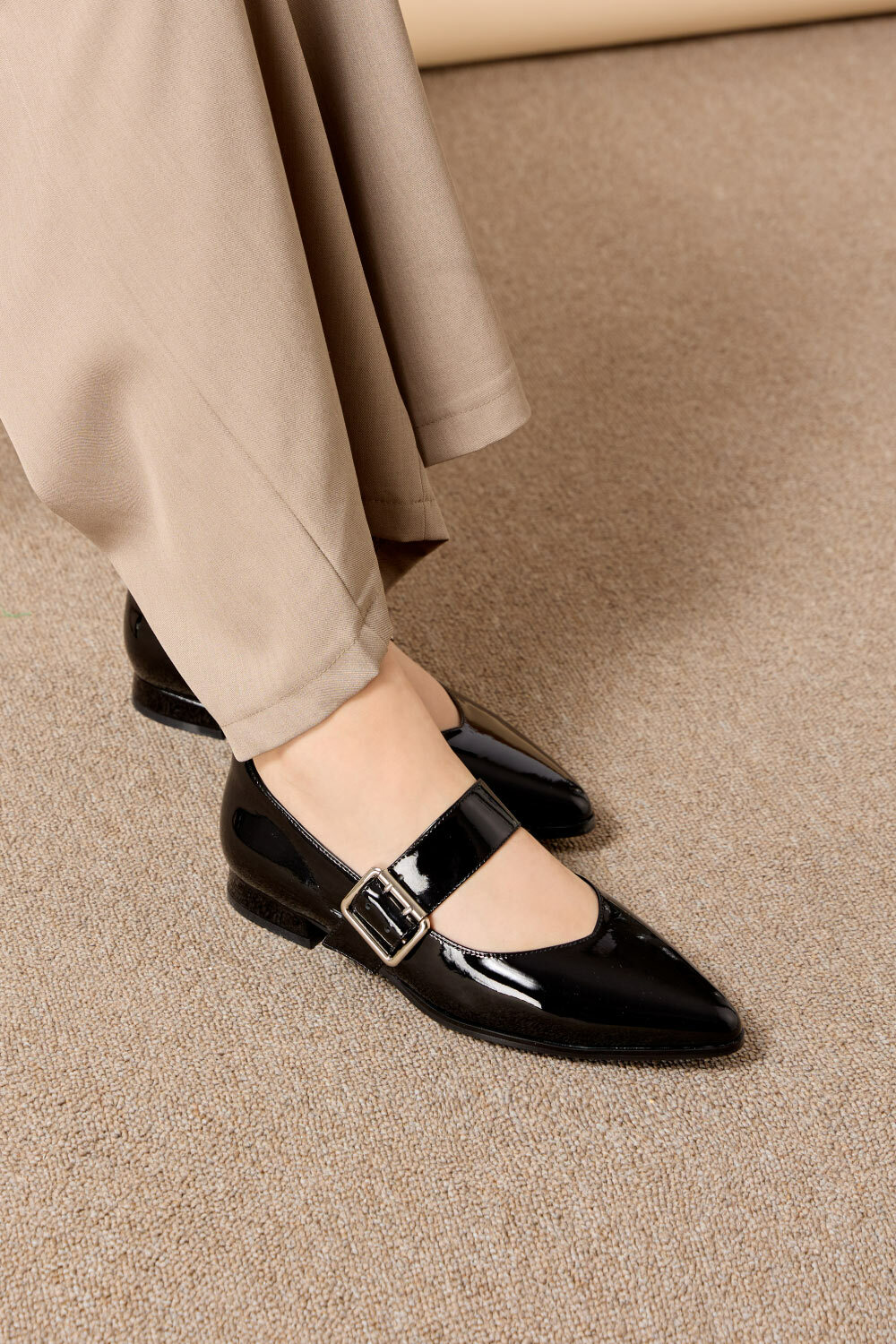 尖頭寬帶方釦漆皮瑪莉珍鞋 黑色