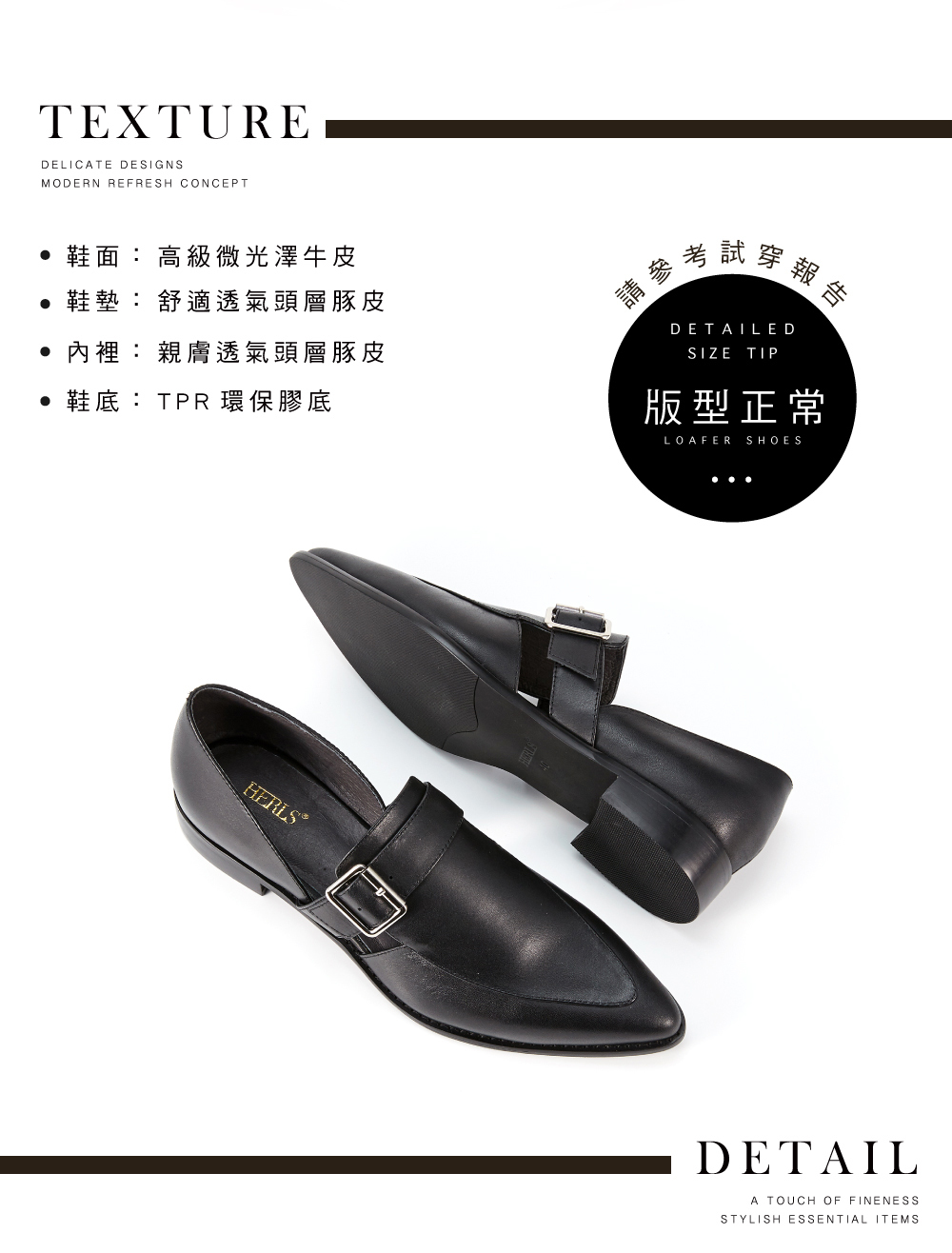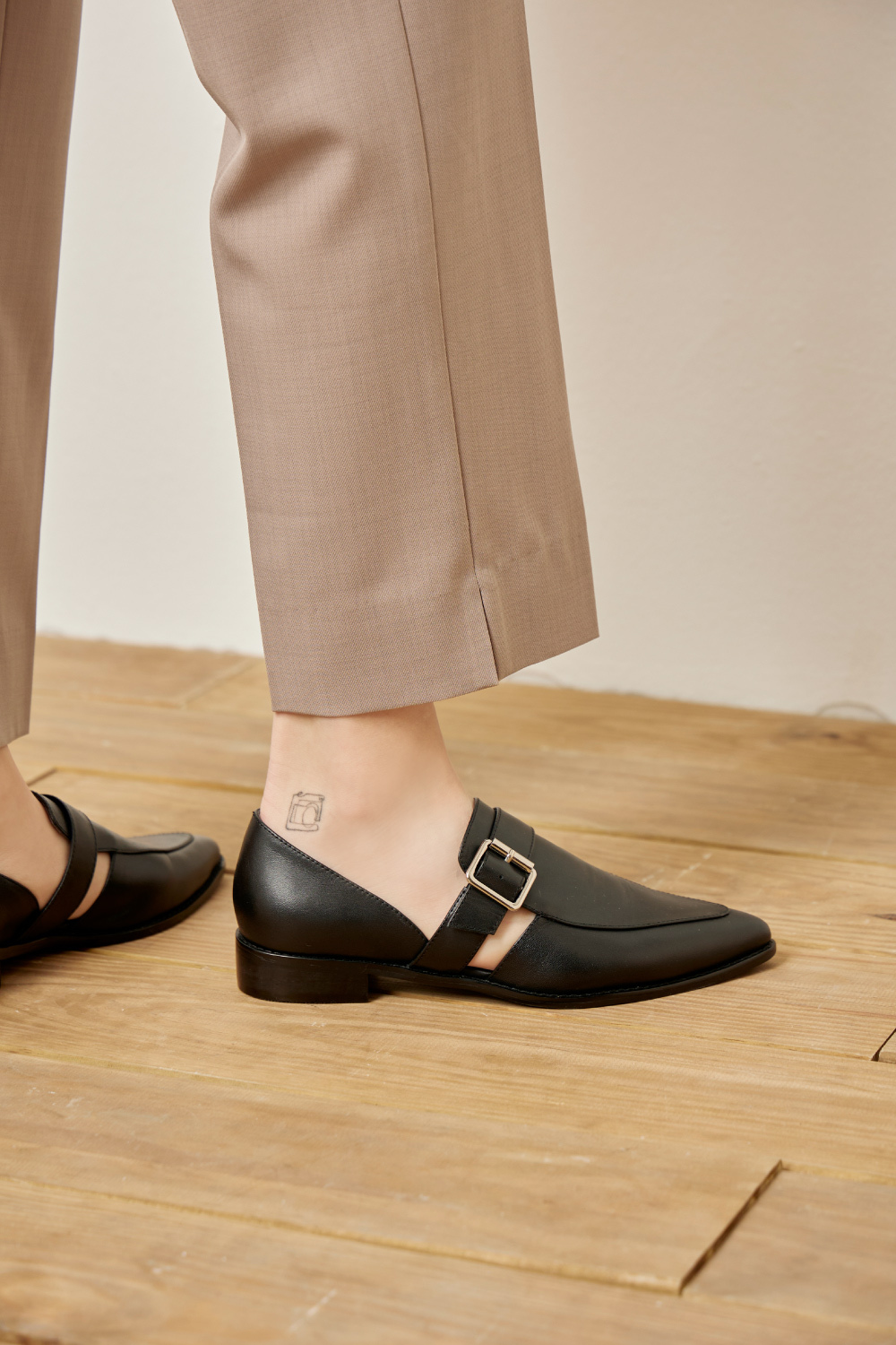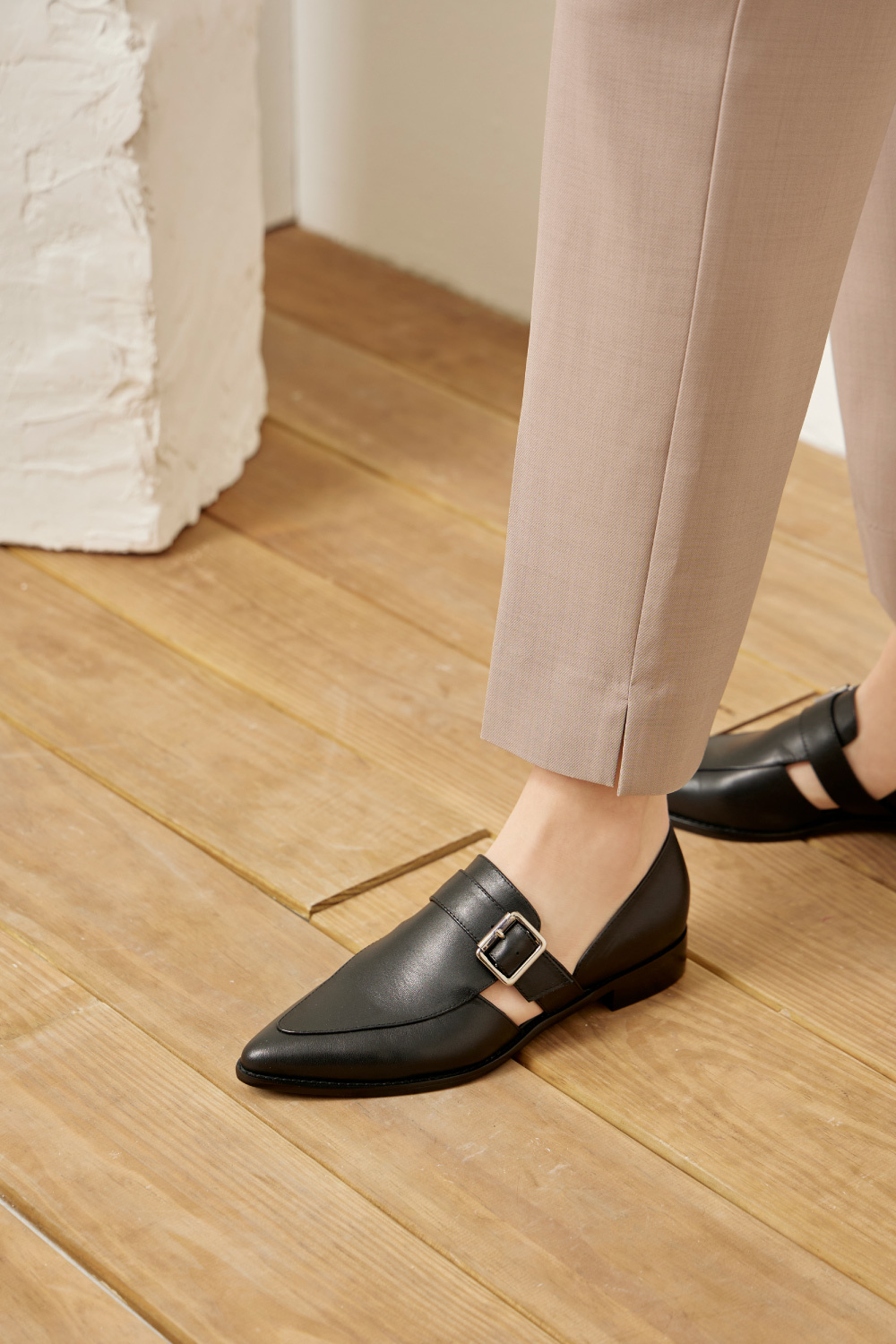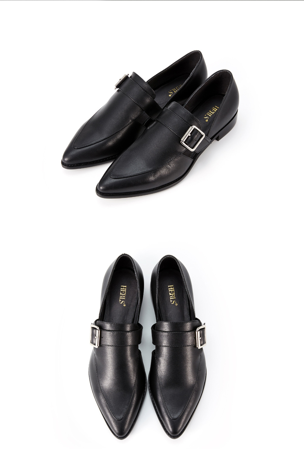[獨家訂製楦型] 時髦全真皮側V橫帶釦環尖頭樂福鞋 黑色