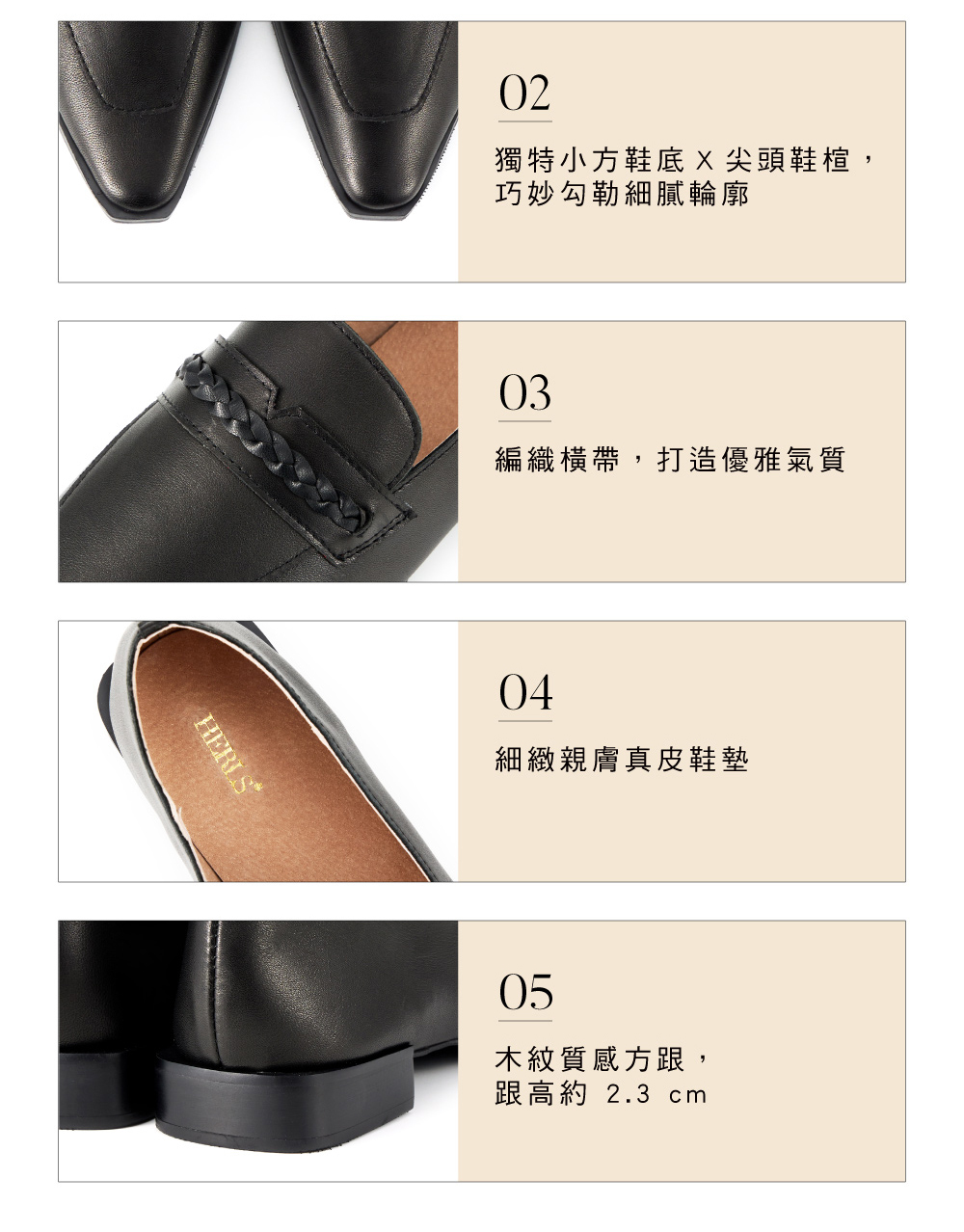 │木紋質感方跟,跟高約 2.3 cm