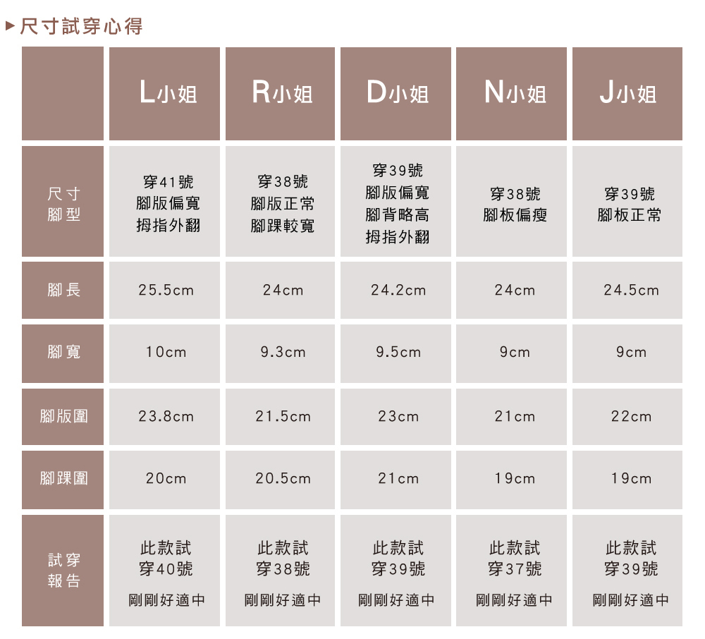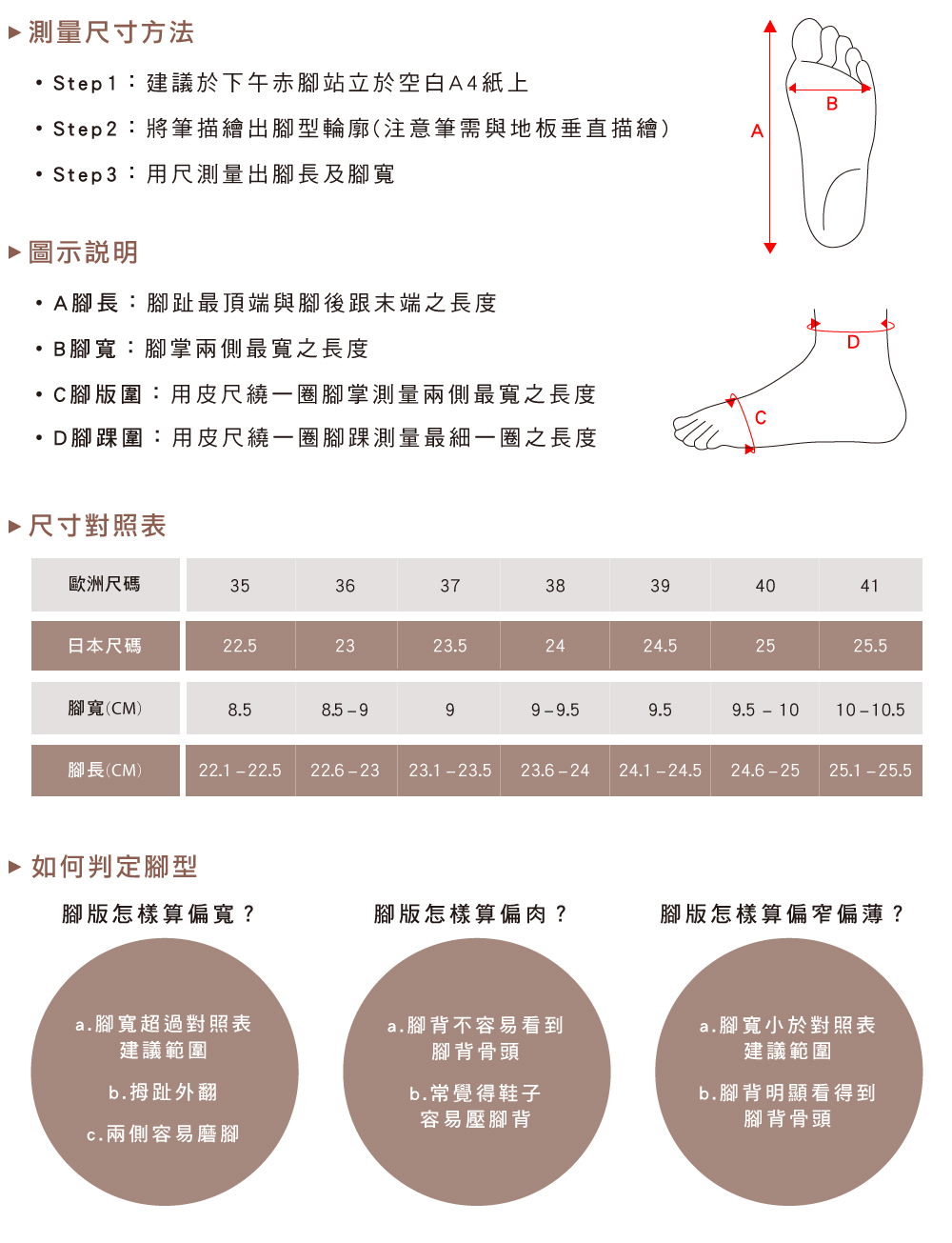 ※ 此鞋款版型正常,請依正常尺寸挑選;腳版偏瘦可選小一號或搭配半墊較合適(建議參考下方試穿說明,依腳長、腳寬、腳板圍選擇適合尺寸)