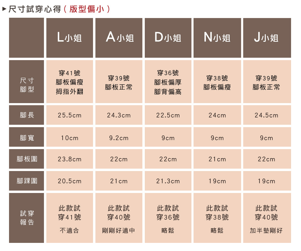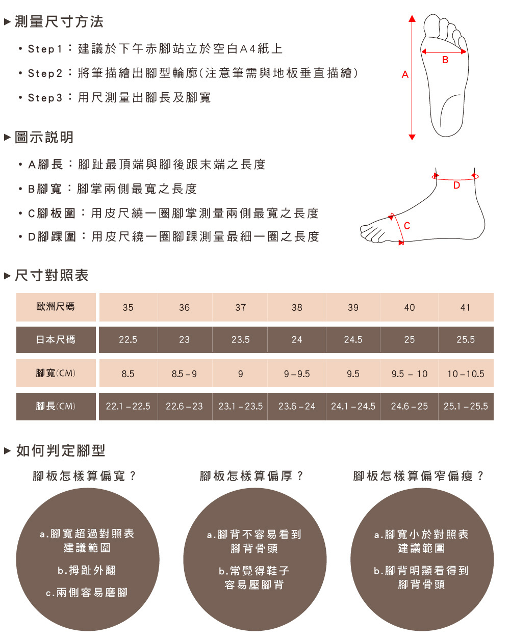 ※ 此鞋款版型偏小,建議挑選大一號較舒適;若腳板偏瘦,可依平常穿著尺寸挑選