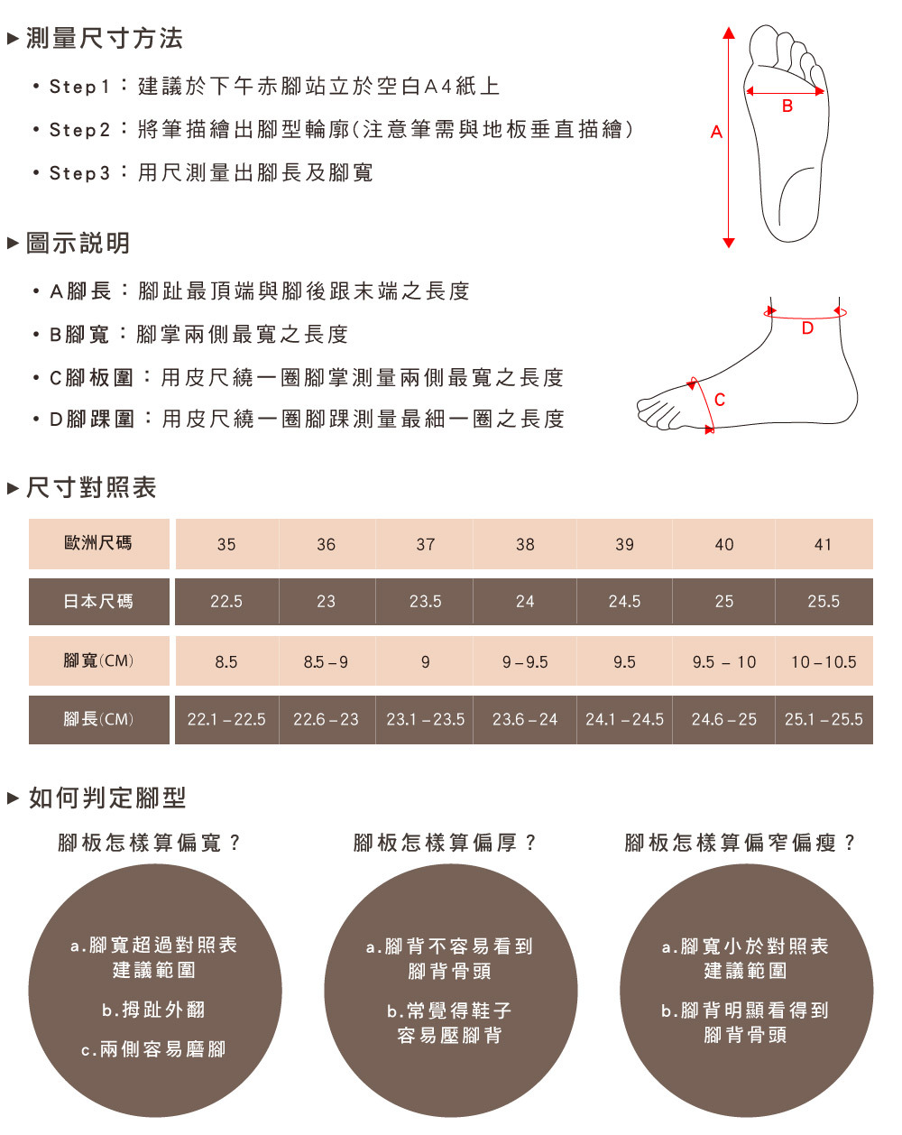 ※ 此鞋款版型略小,若腳板偏寬/厚,建議挑選大一號略鬆舒適;若腳板偏瘦,可依平常穿著尺寸挑選。