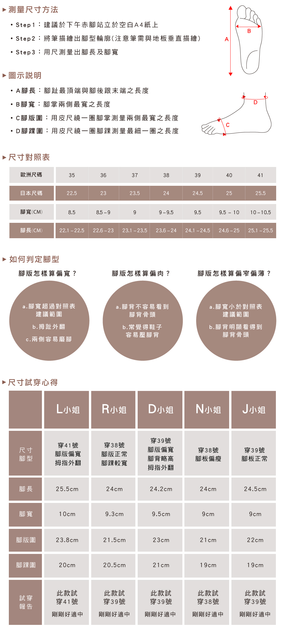 ※ 此鞋款版型正常,請依正常尺寸挑選(建議參考下方試穿說明,依腳長、腳寬、腳板圍選擇適合尺寸)