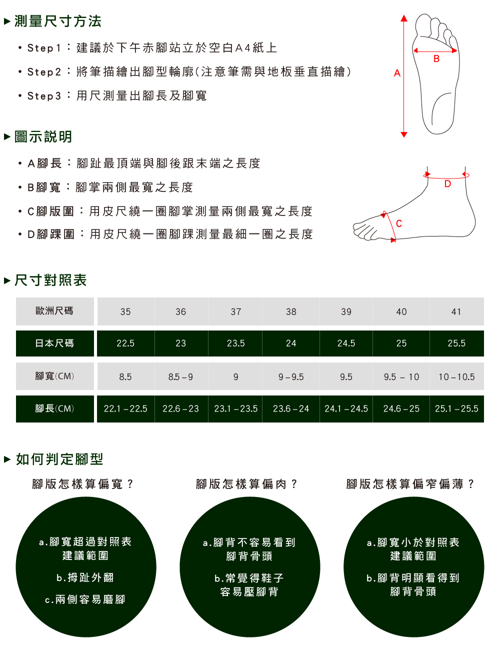 ※ 版型正常,請依正常尺寸挑選(建議參考下方試穿說明,依腳長、腳寬、腳板圍選擇適合尺寸)
