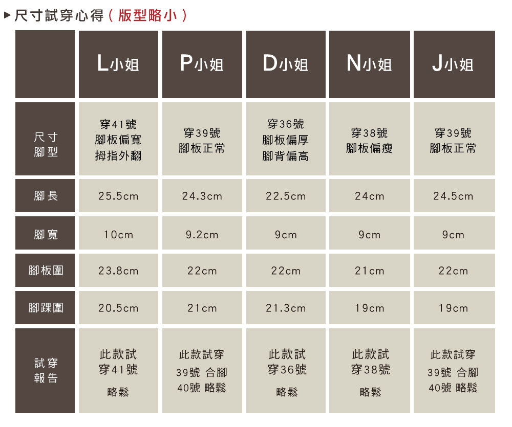 ※ 此鞋款版型略小,可依平常穿著尺寸挑選合腳;若腳板寬/厚或拇指外翻,建議挑選大一號較舒適
