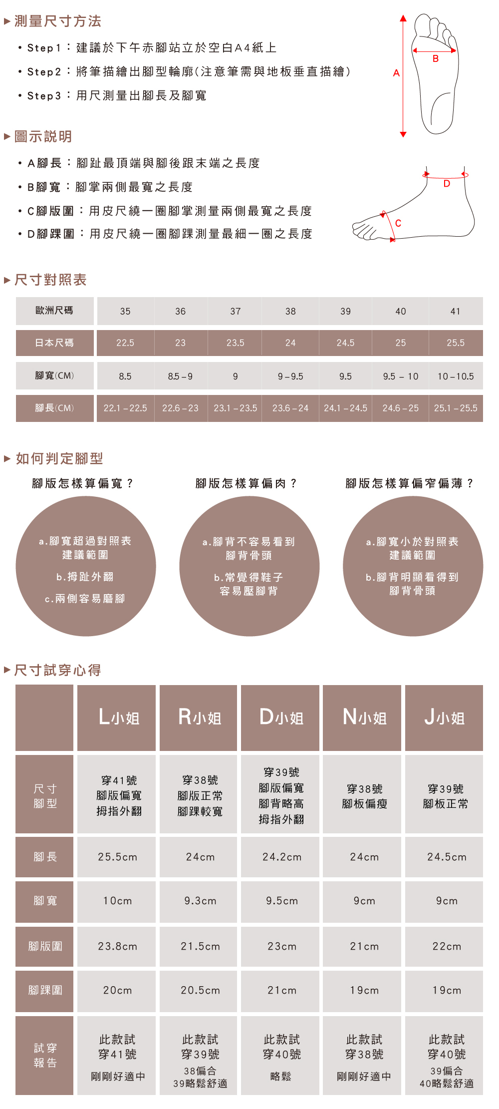 ※ 此鞋款版型偏小,建議選大一號較舒適;腳板偏瘦可依正常尺寸挑選(建議參考下方試穿說明,依腳長、腳寬、腳板圍選擇適合尺寸)