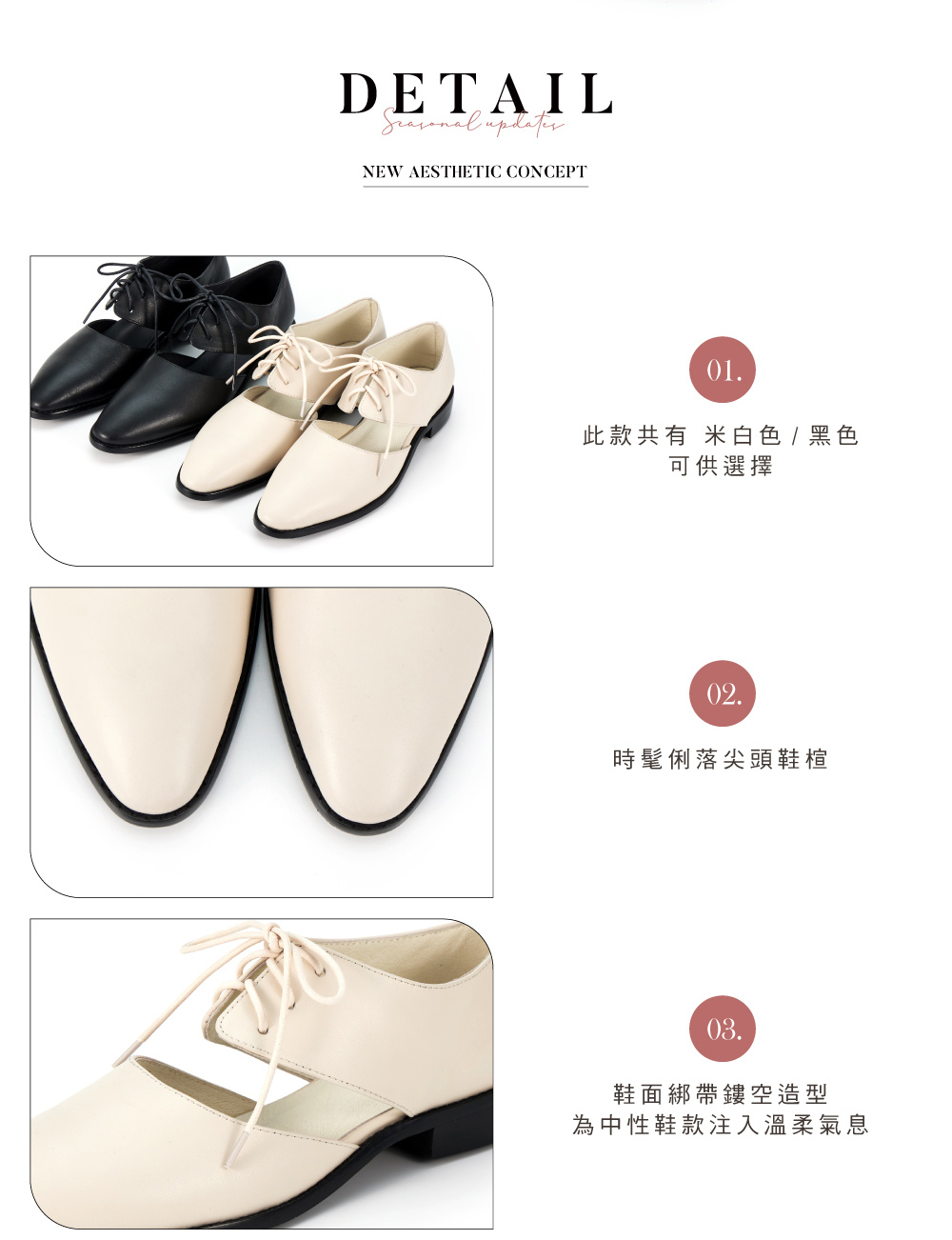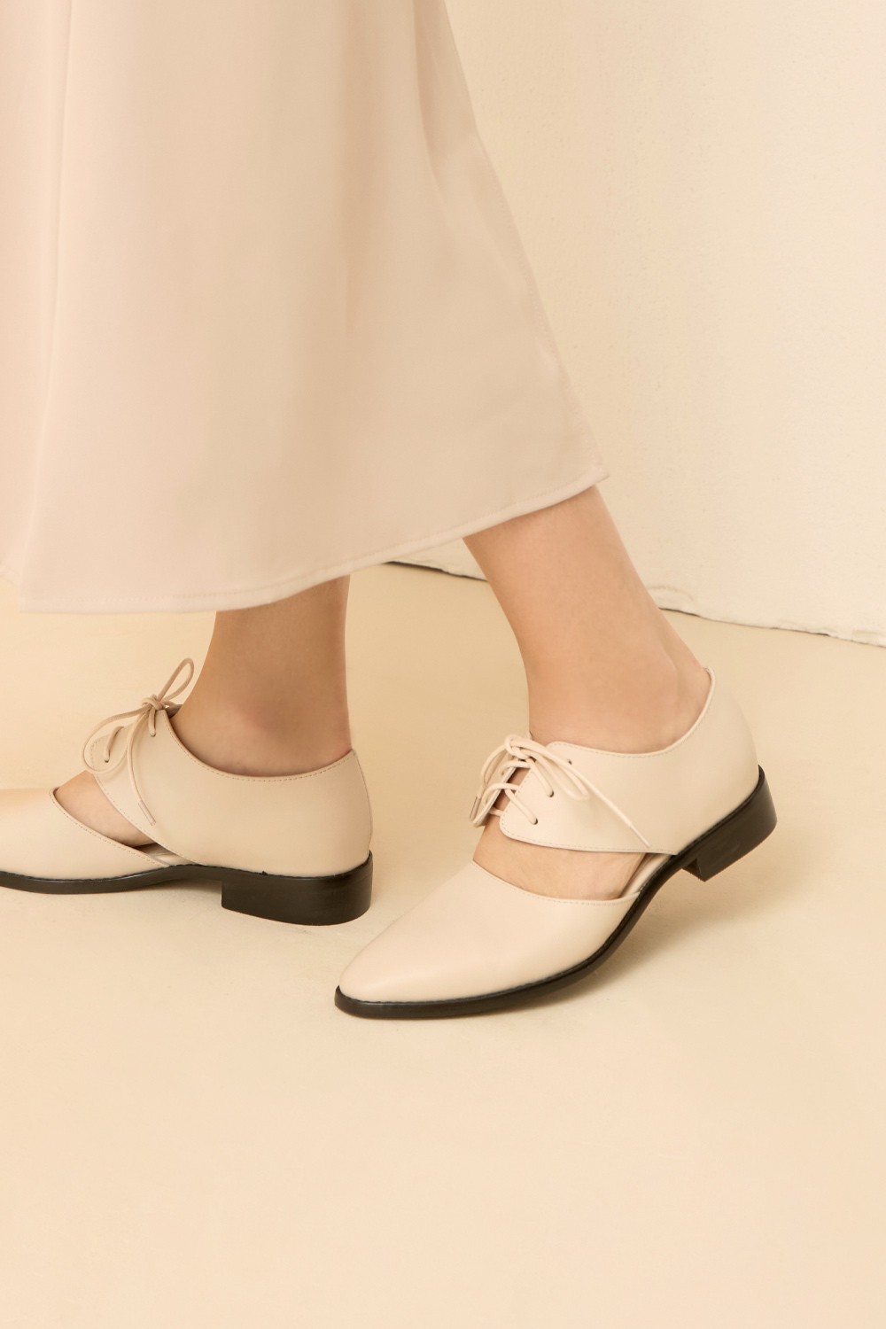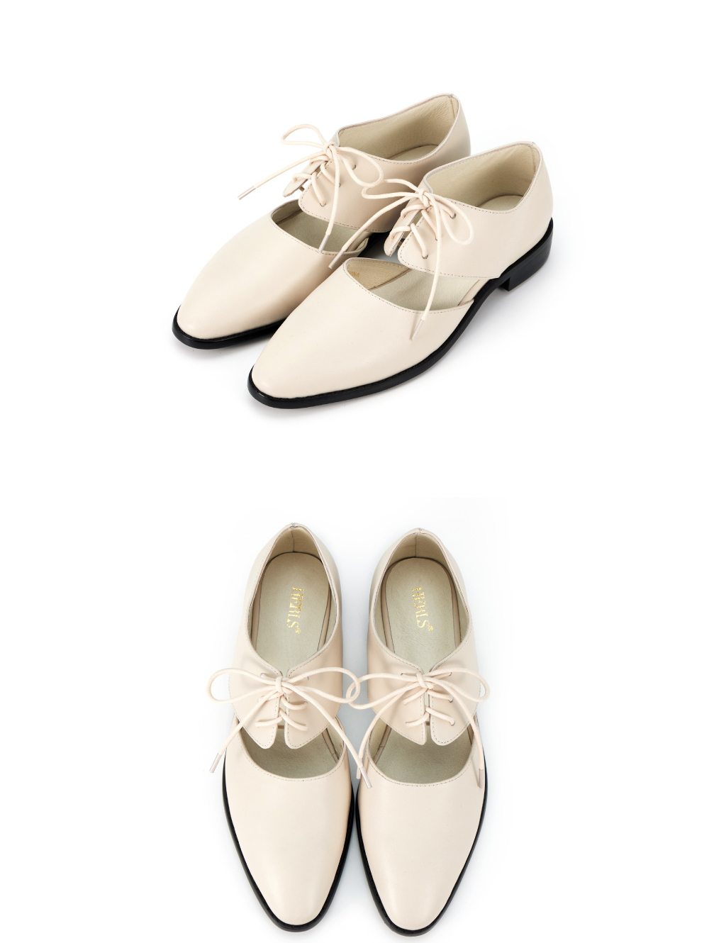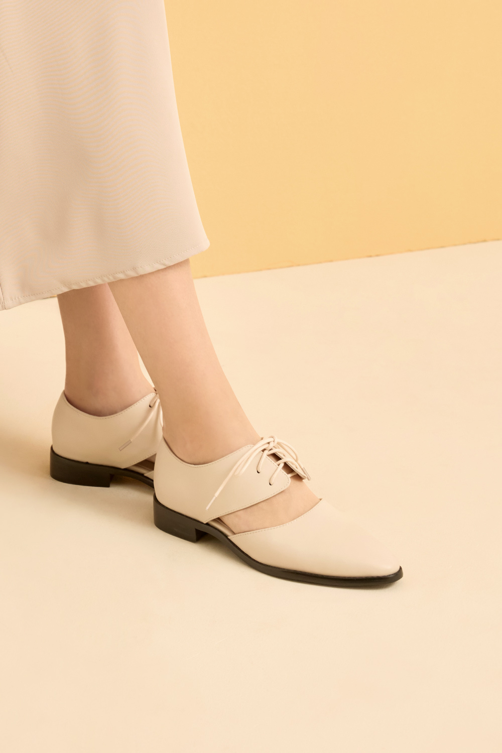 [獨家訂製楦型]全真皮鏤空綁帶尖頭低跟牛津鞋 米白色