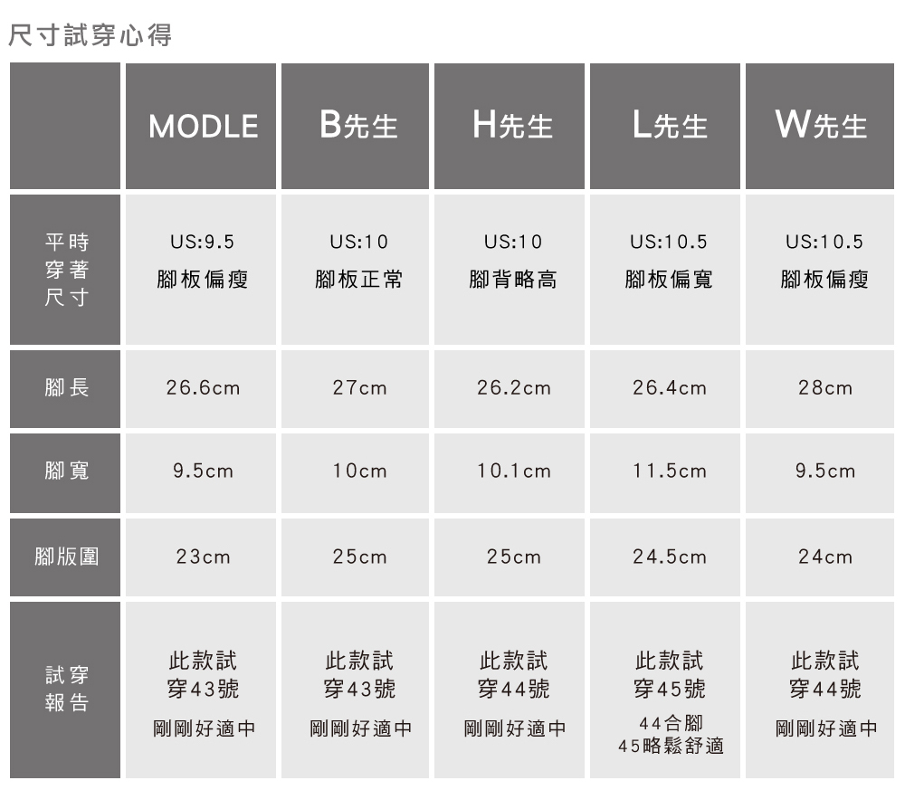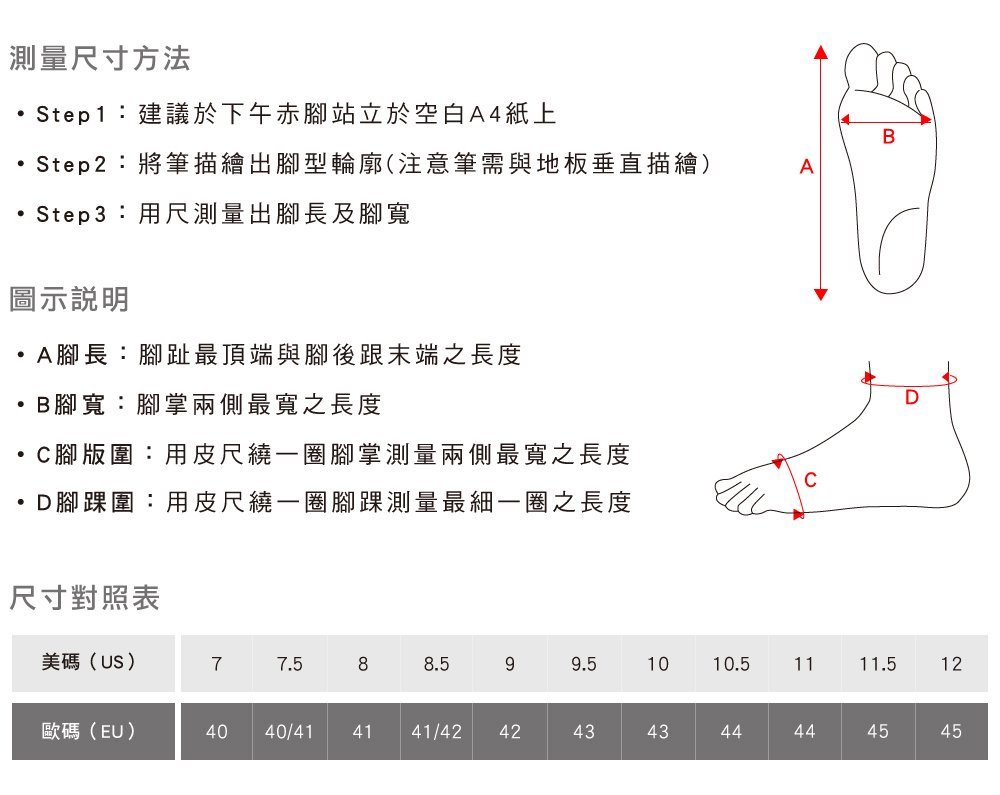 ※ 版型正常,請依正常尺寸挑選;若腳背高/腳板寬/拇指外翻者建議挑選大一號較舒適(建議參考下方試穿說明,依腳長、腳寬、腳板圍選擇適合尺寸)