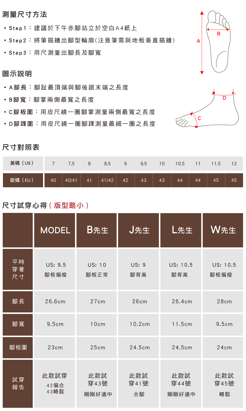 ※ 此鞋款版型略小,可依平常尺寸挑選合腳,或依穿著習慣挑選大一號略鬆舒適;若腳板偏寬/厚或有拇指外翻,建議挑選大一號較合適。
