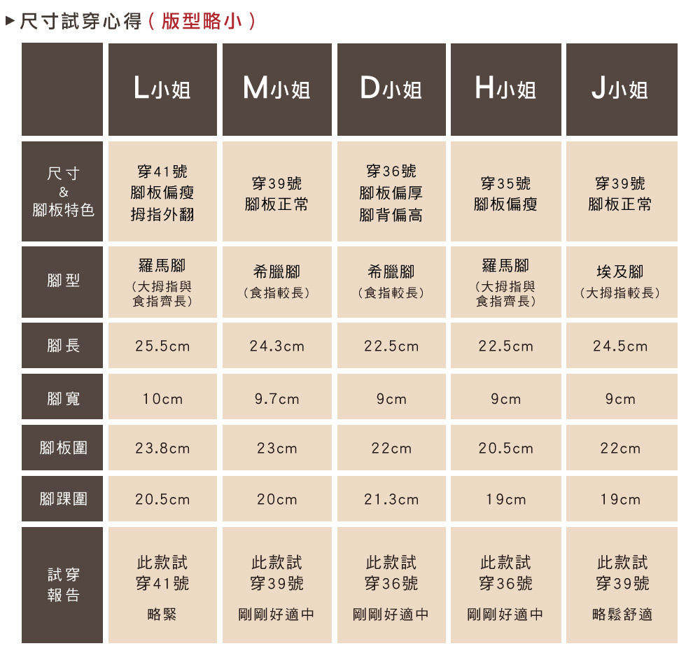 ※ 此鞋款版型略小,若腳板偏寬/厚或有拇指外翻,建議挑選大一號較舒適;若腳板偏瘦,可依平常穿著尺寸挑選。