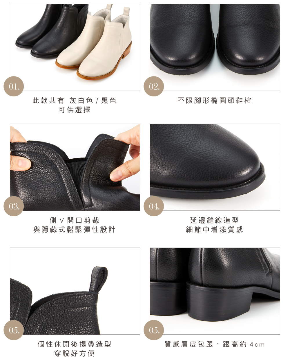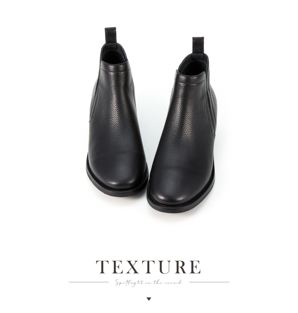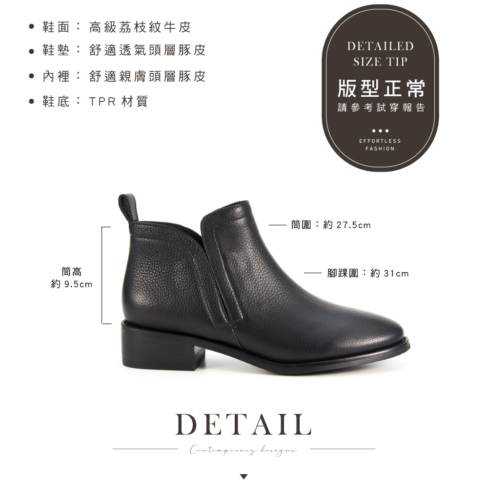 荔枝紋牛皮側V鬆緊橢圓頭粗跟踝靴 黑色