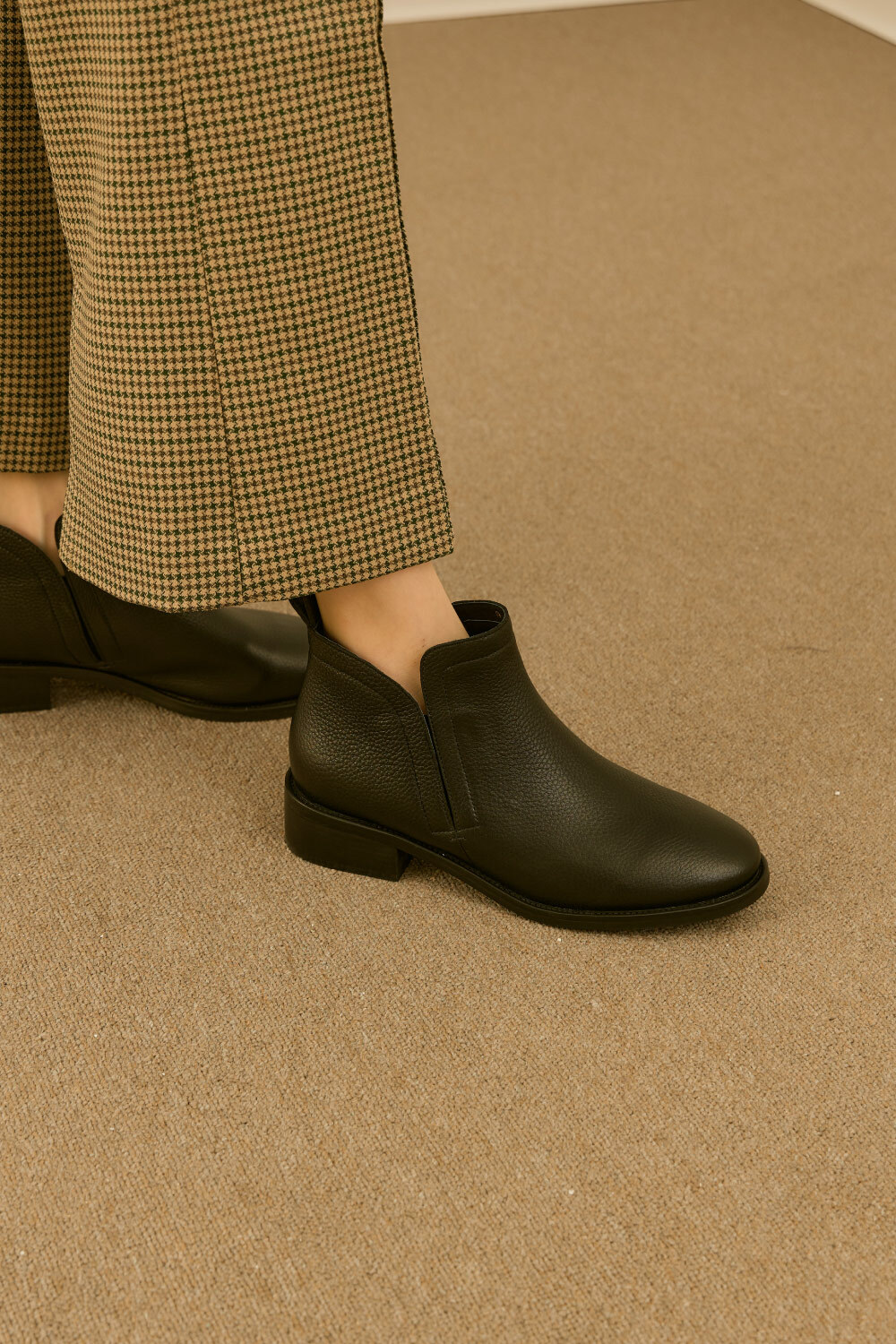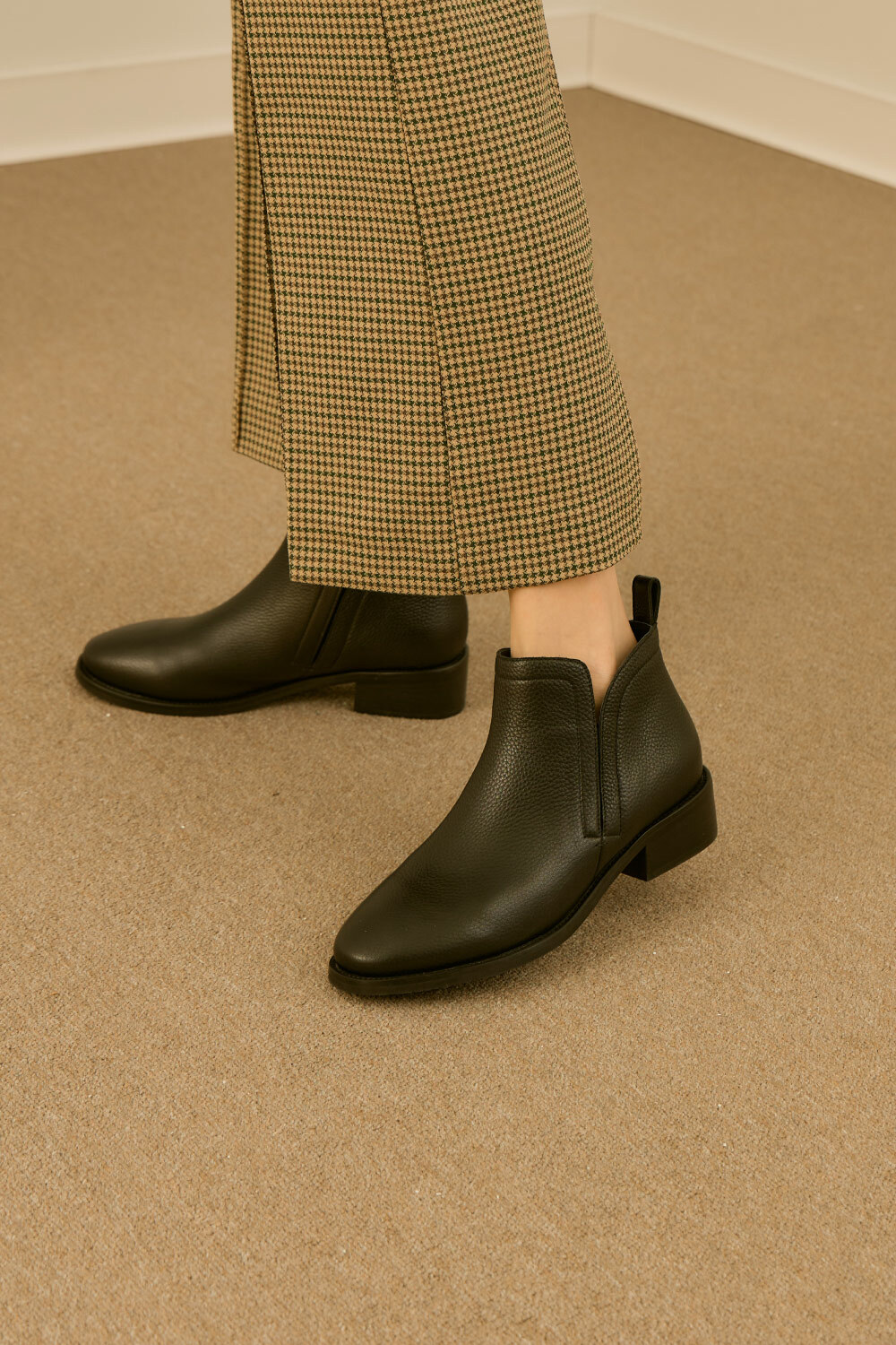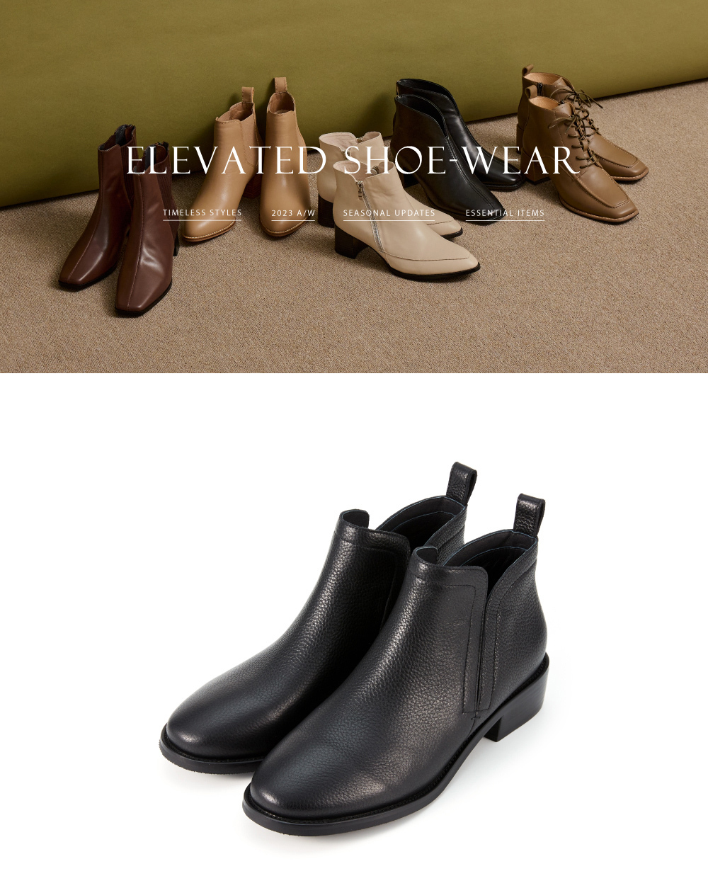 荔枝紋牛皮側V鬆緊橢圓頭粗跟踝靴 黑色