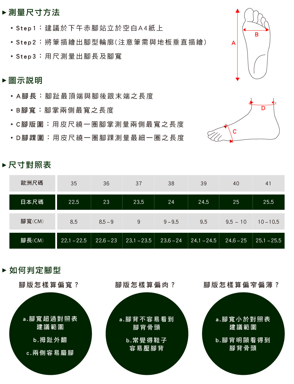 ※ 此鞋款版型偏小,建議選大一號較舒適(建議參考下方試穿說明,依腳長、腳寬、腳板圍選擇適合尺寸)