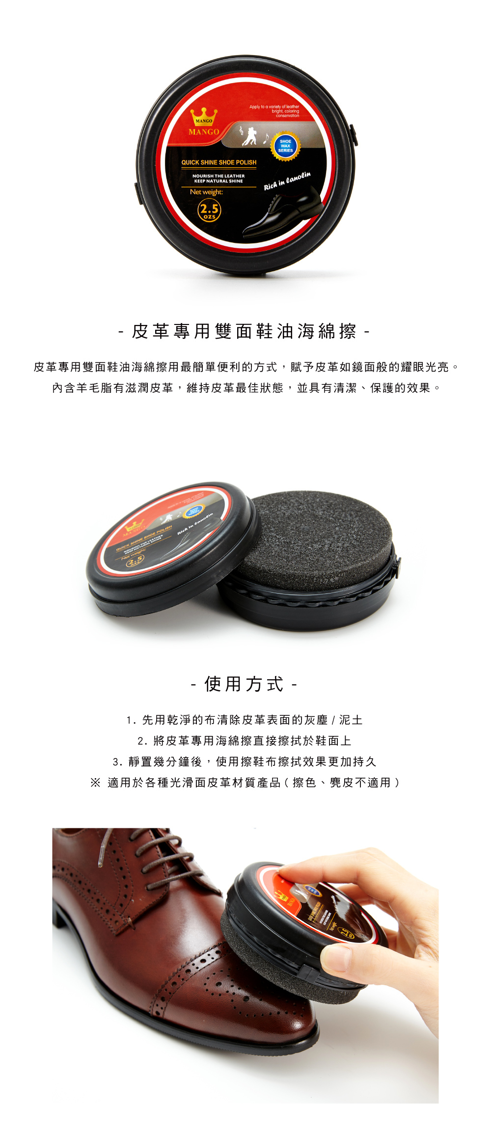 ※ 適用於各種光滑面皮革材質產品(擦色、麂皮不適用)