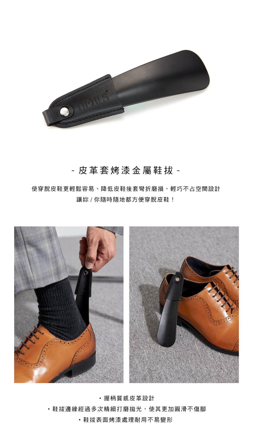 『皮革套烤漆金屬鞋拔』使穿脫皮鞋更輕鬆容易,降低皮鞋後套彎折磨損,