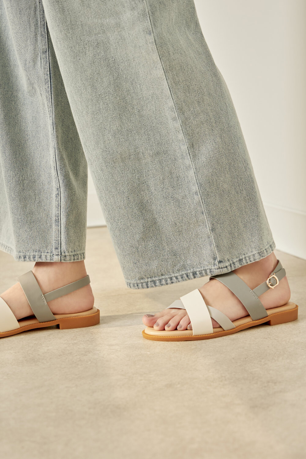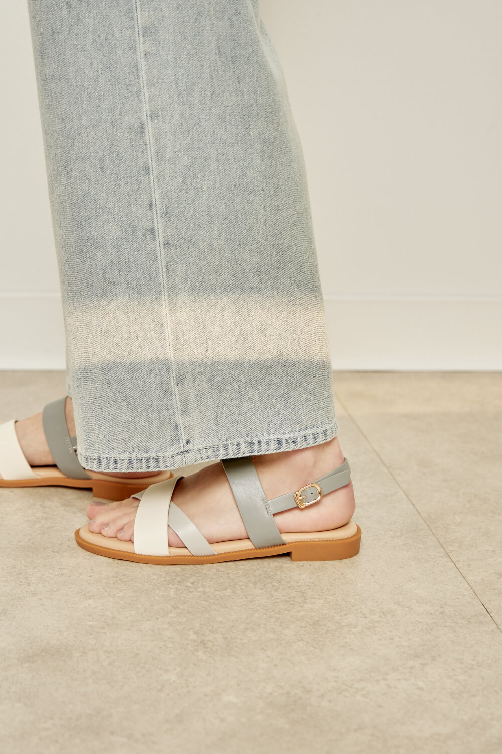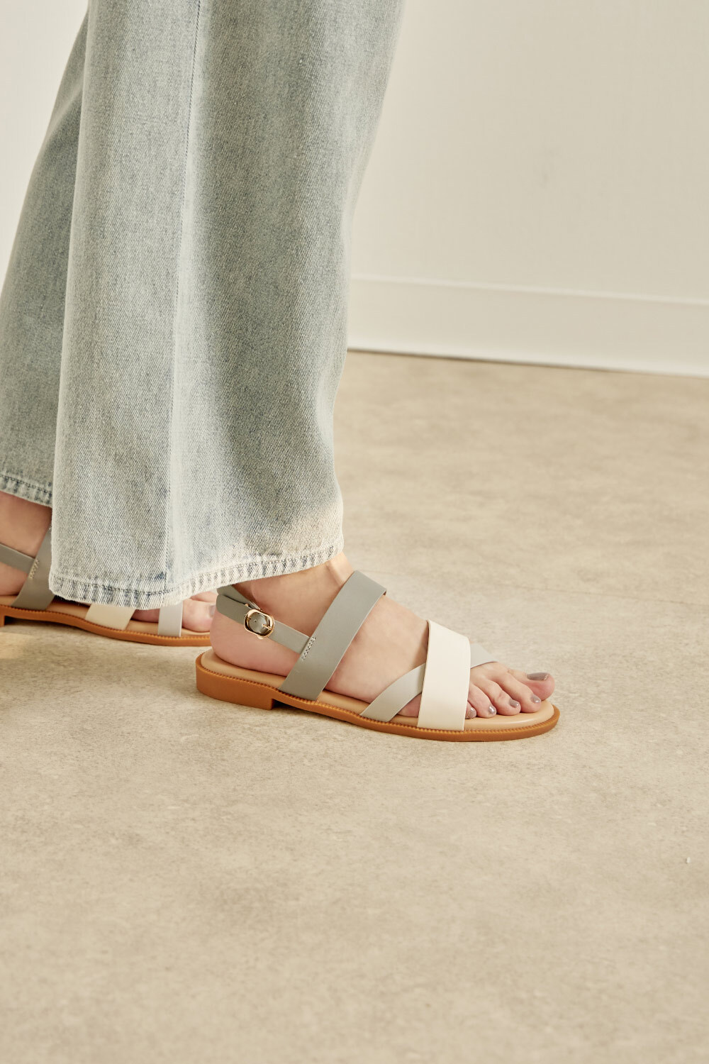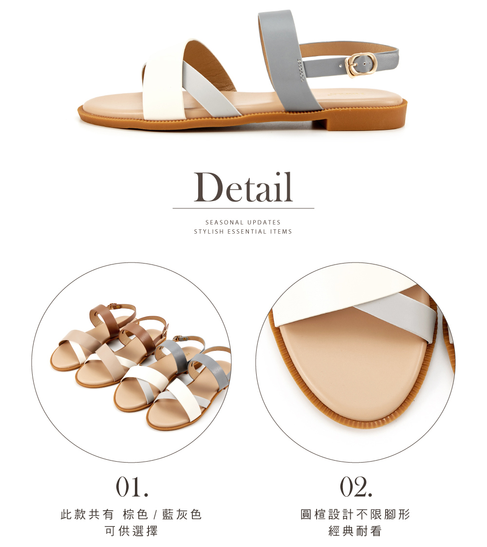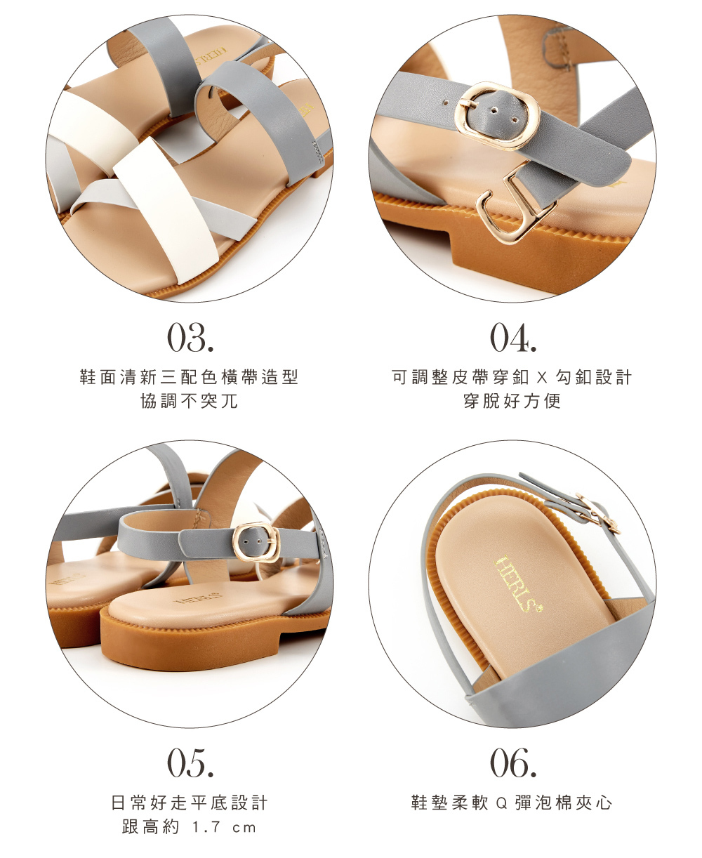 三配色橫帶露趾後帶平底涼鞋 藍灰色