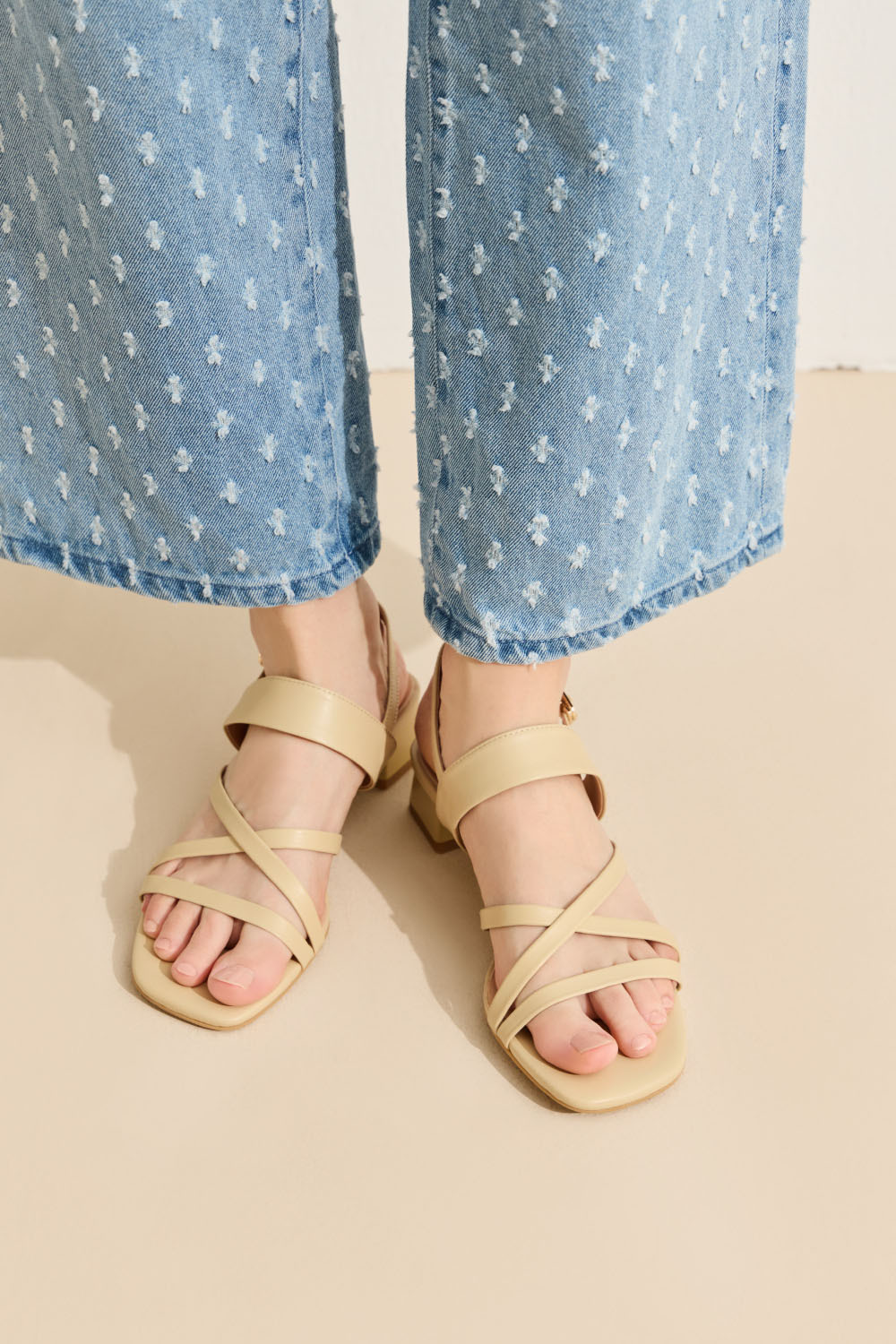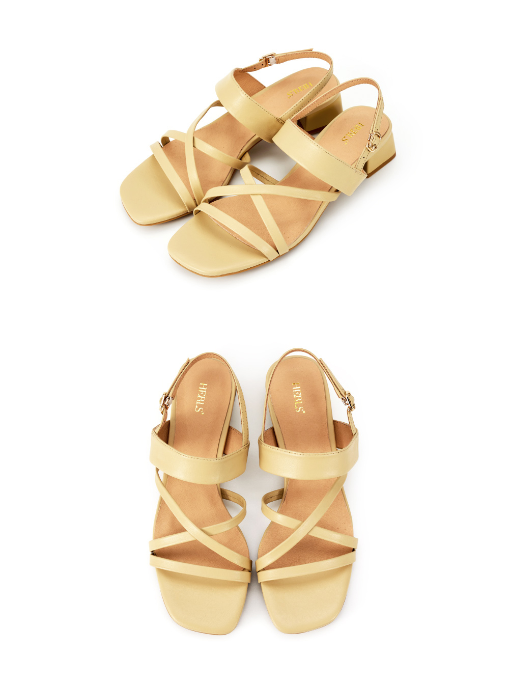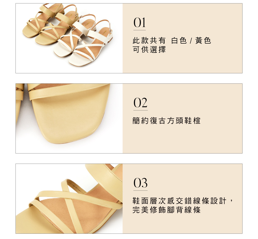 全真皮交錯線條方頭後帶粗跟涼鞋 黃色