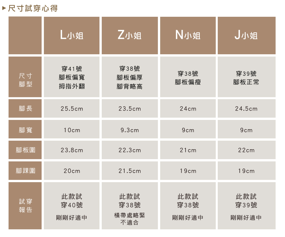 ※ 此鞋款版型正常,可依正常尺寸挑選;腳板厚橫帶處略緊偏合,請斟酌購買。選購前建議參考下方試穿報告。